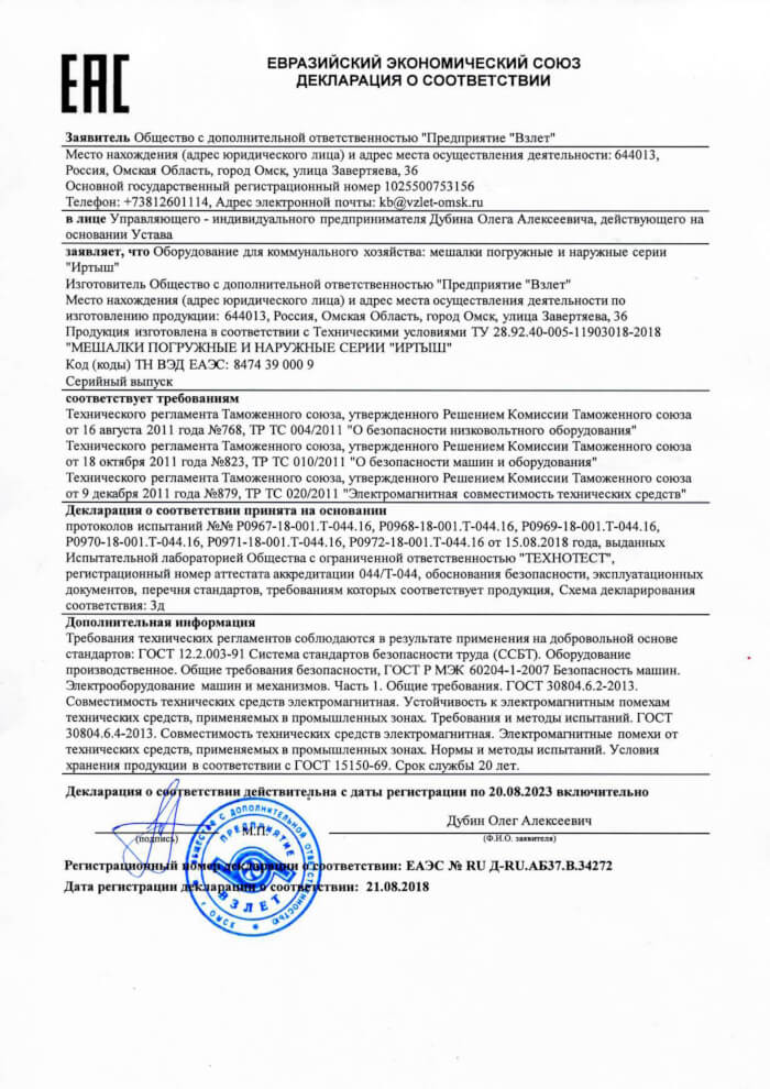 Декларация о соответствии погружных мешалок