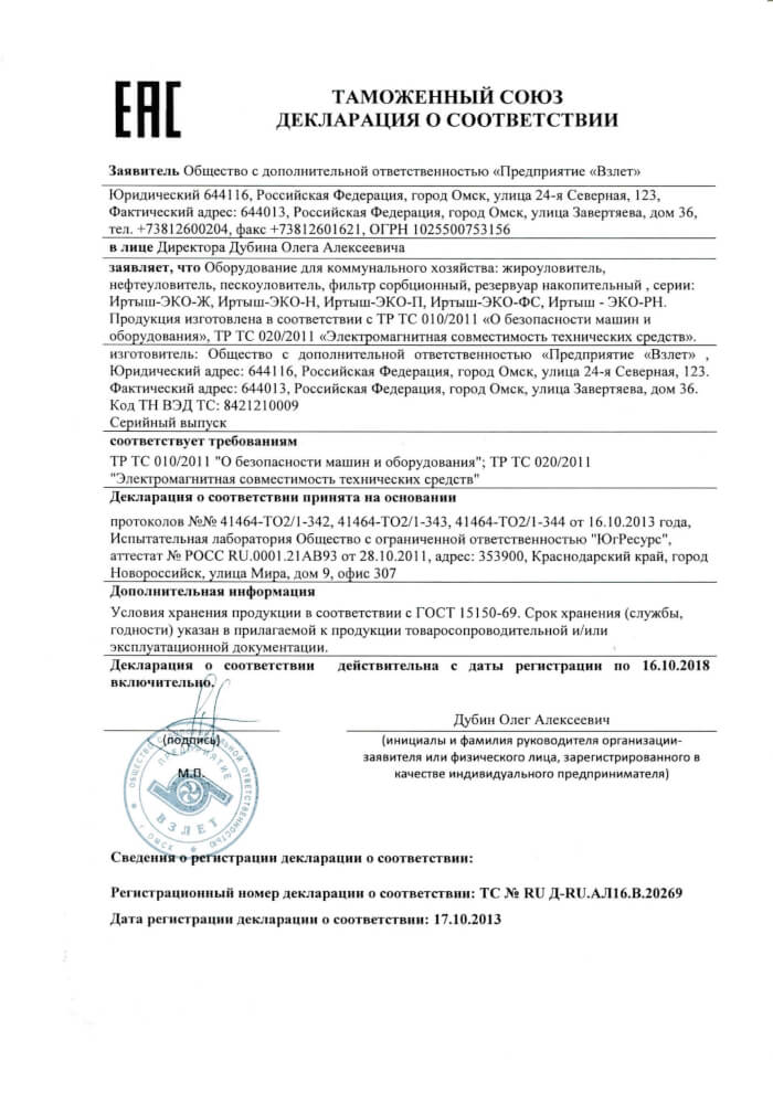Декларация о соответствии очистных сооружений