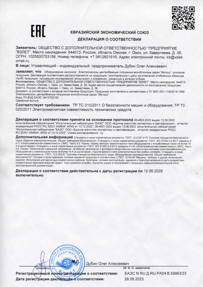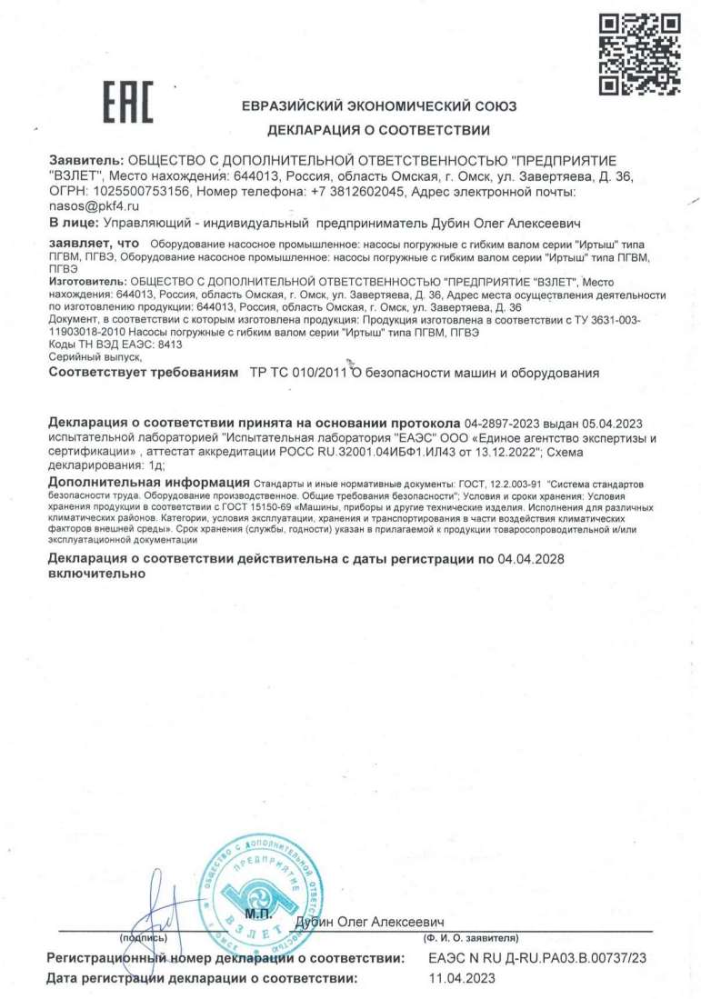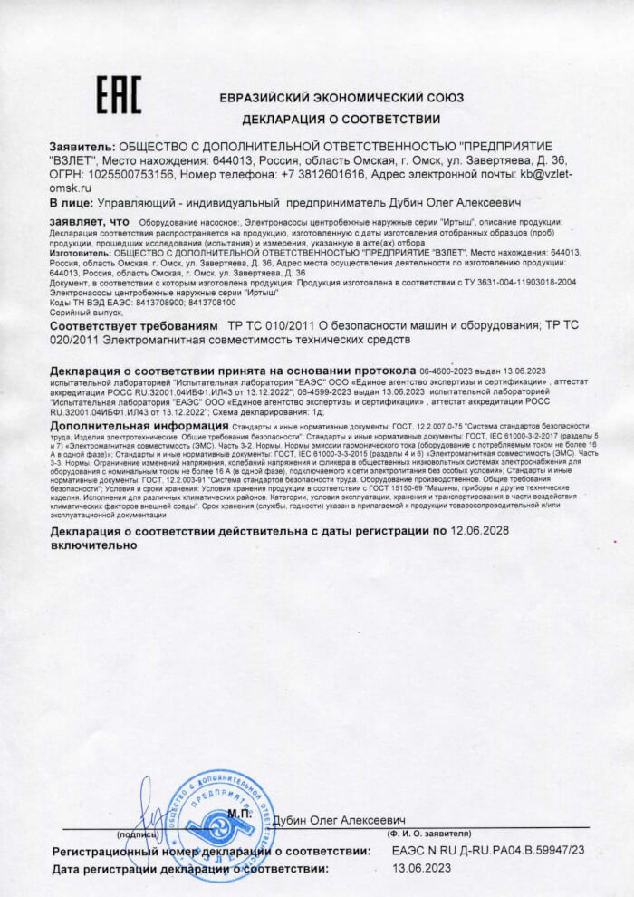 Декларация о соответствии погружных насосов серии Иртыш