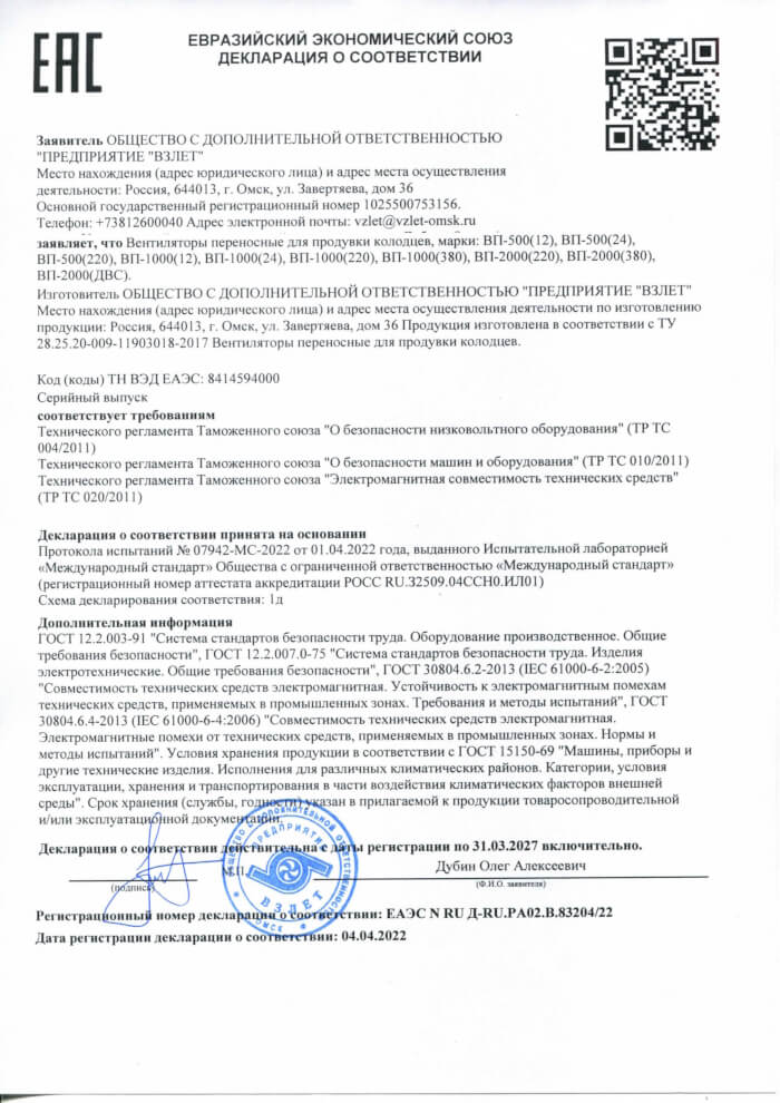Декларация о соответствии вентиляторов для продувки колодцев