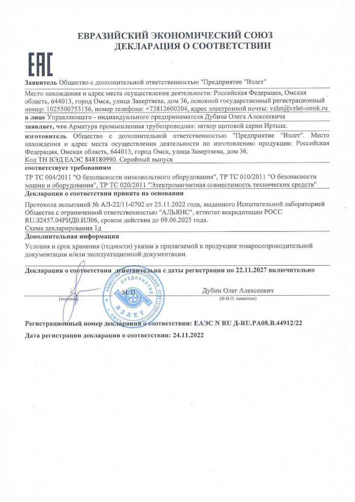 Декларация о соответствии на затворы щитовые серии Иртыш