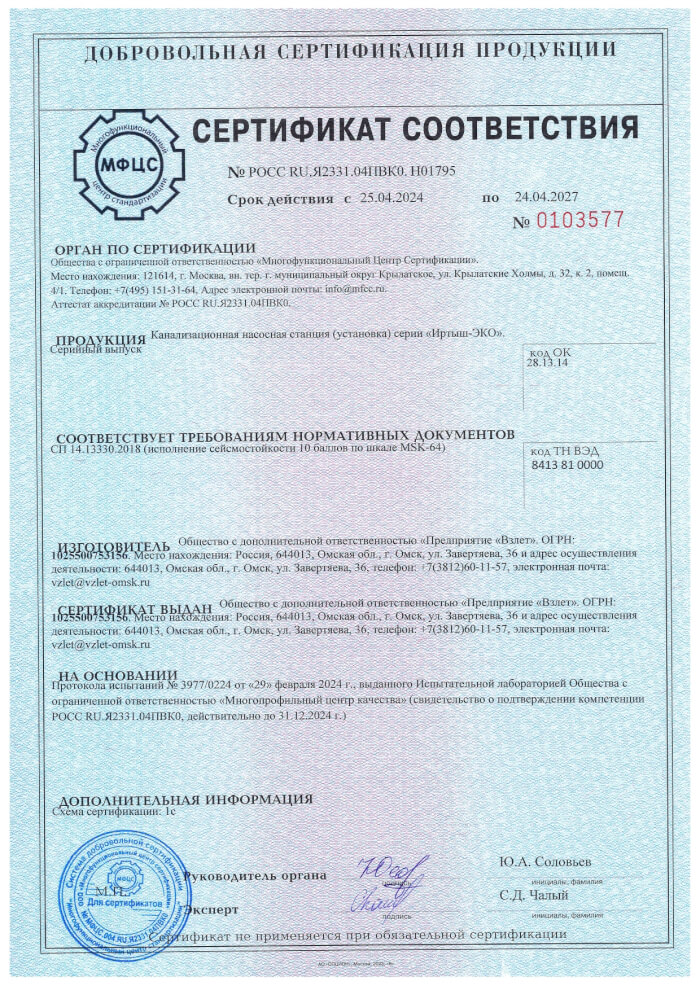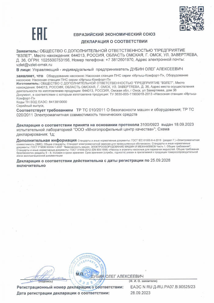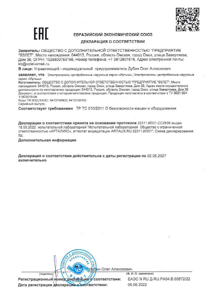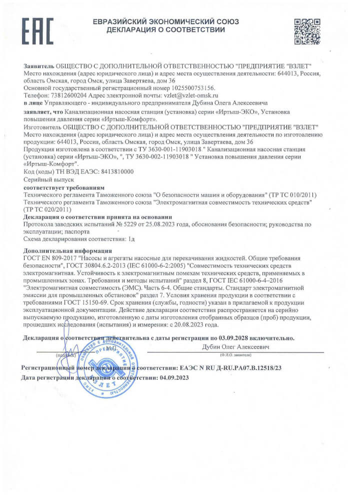 Декларация о соответствии наружных насосов серии Иртыш