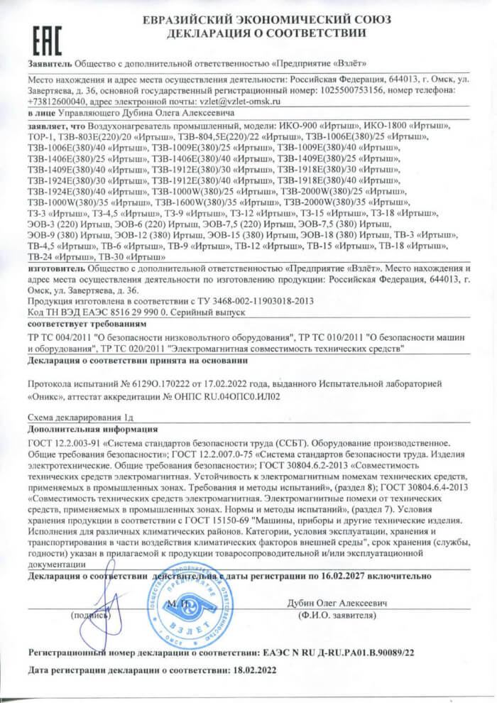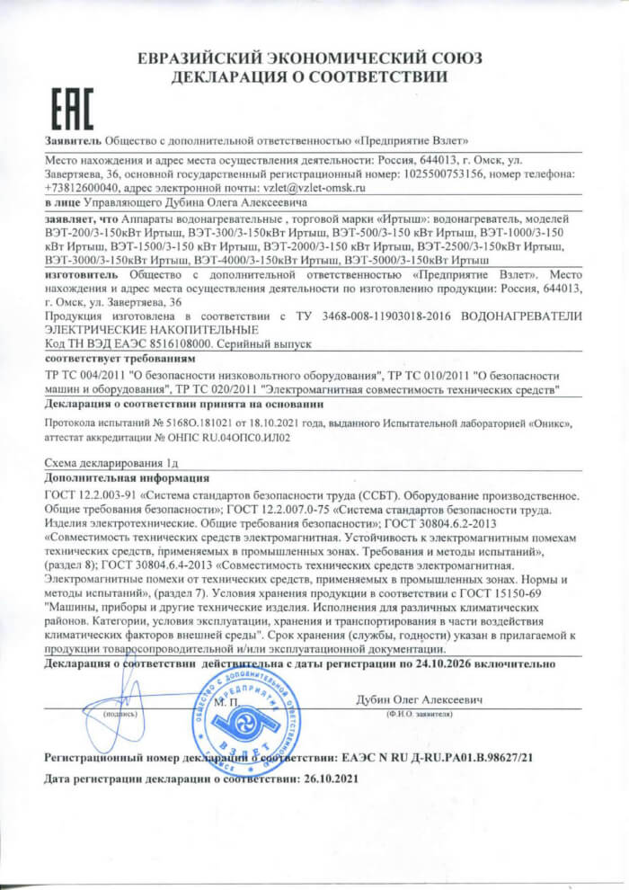 Декларация о соответствии водонагревателей ВЭТ "Иртыш"