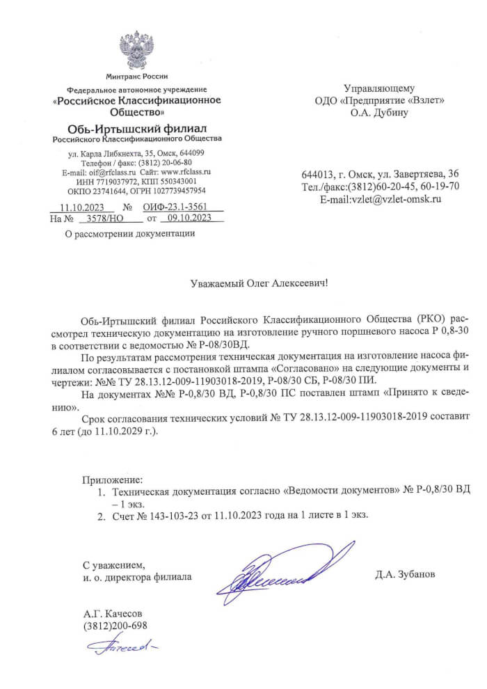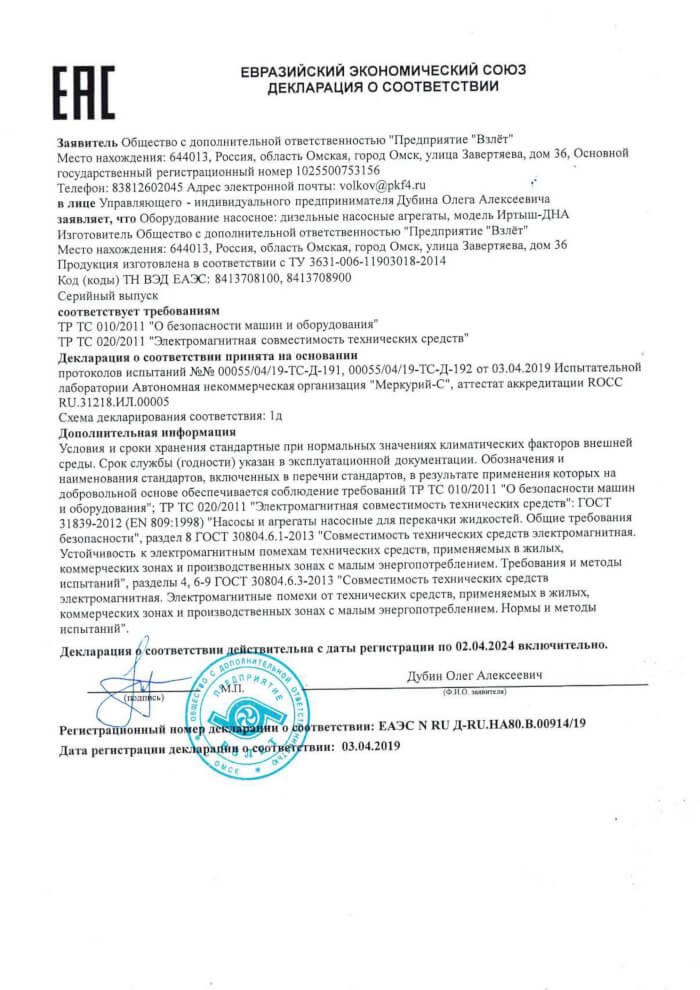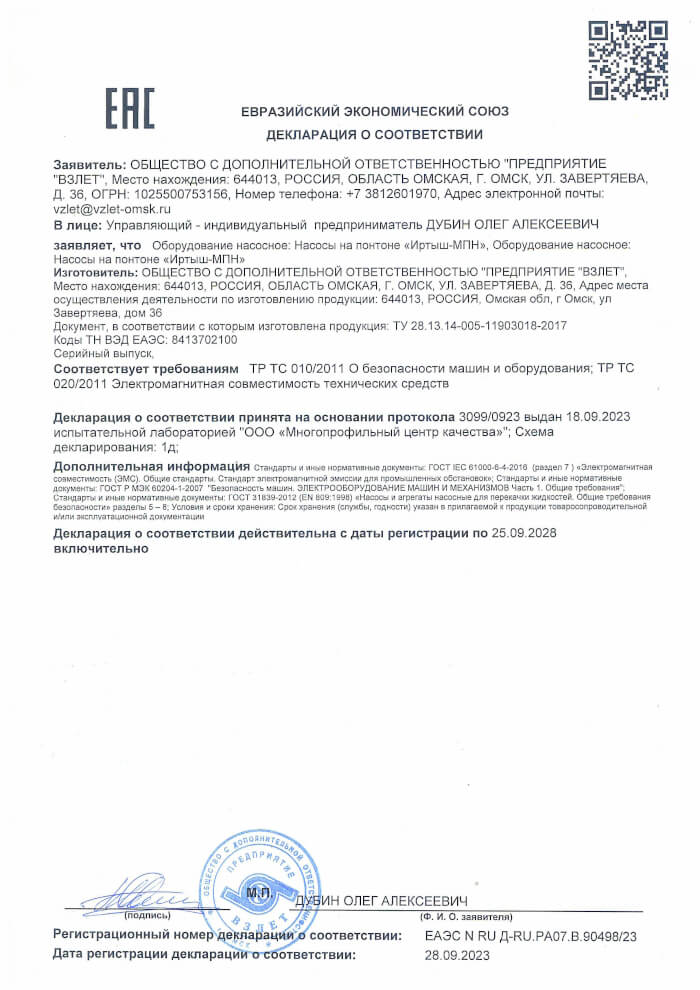 Декларация о соответствии насосов на понтоне «Иртыш-МПН»