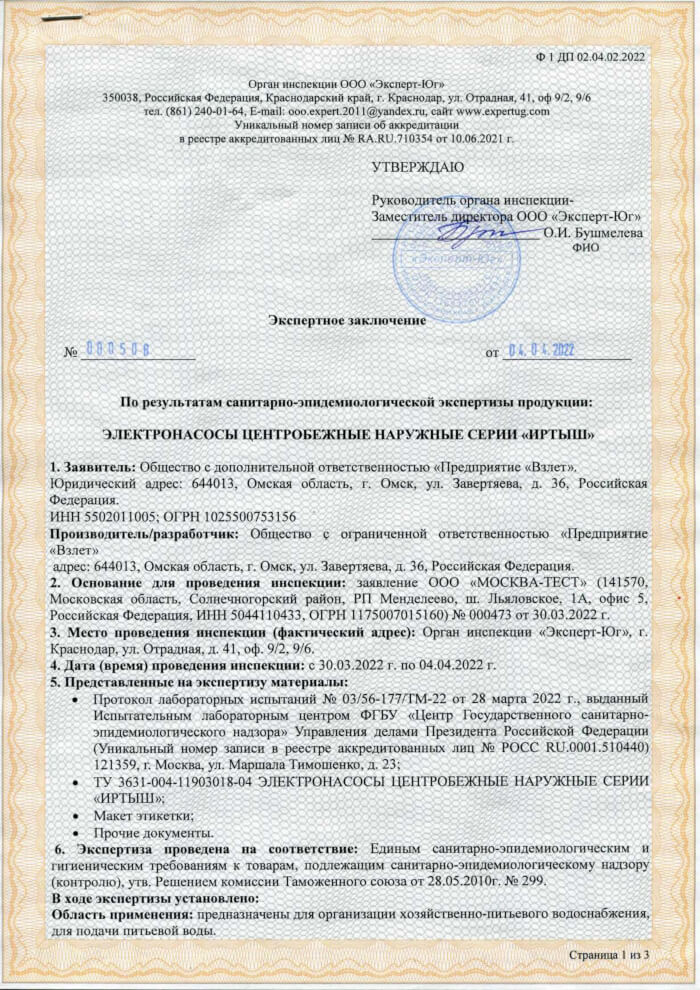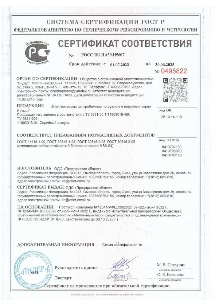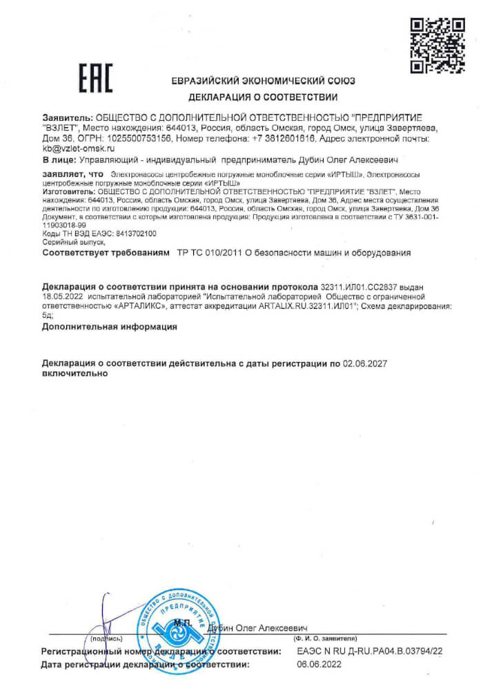 Декларация о соответствии погружных насосов Иртыш по схеме 5Д