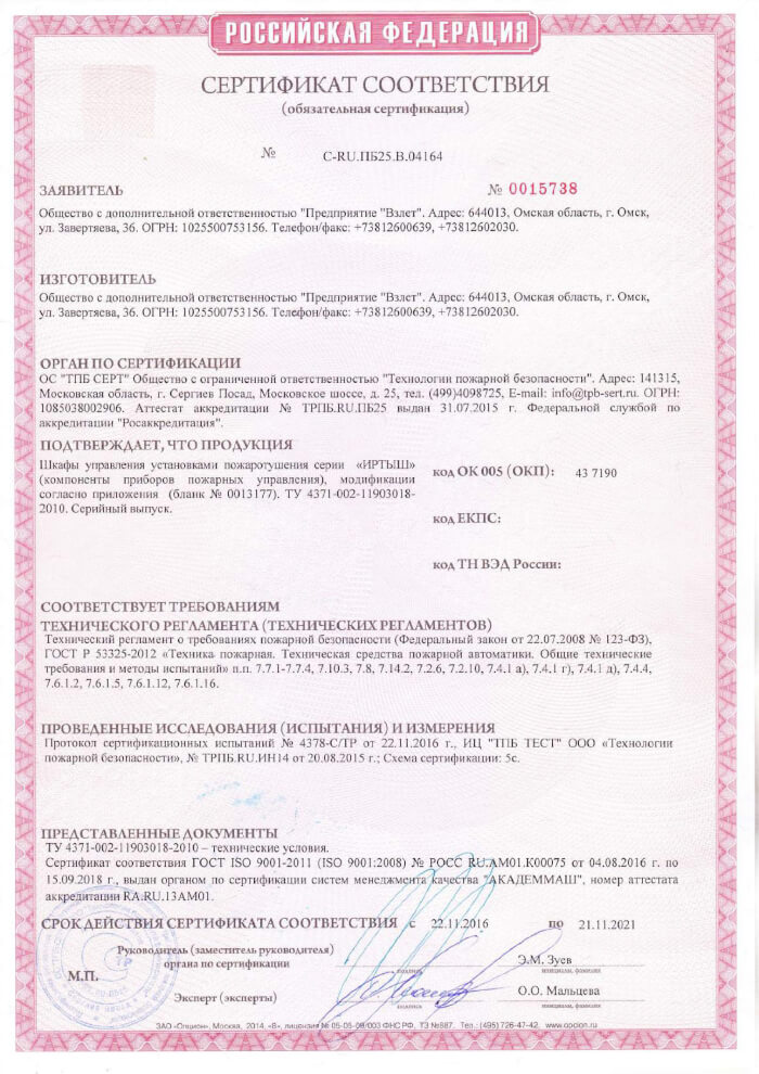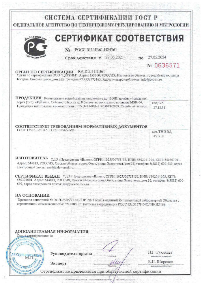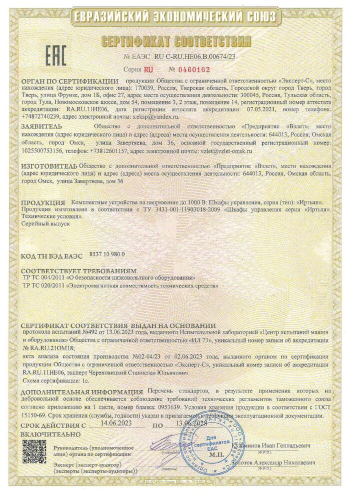 Сертификат соответствия на шкафы управления "Иртыш"