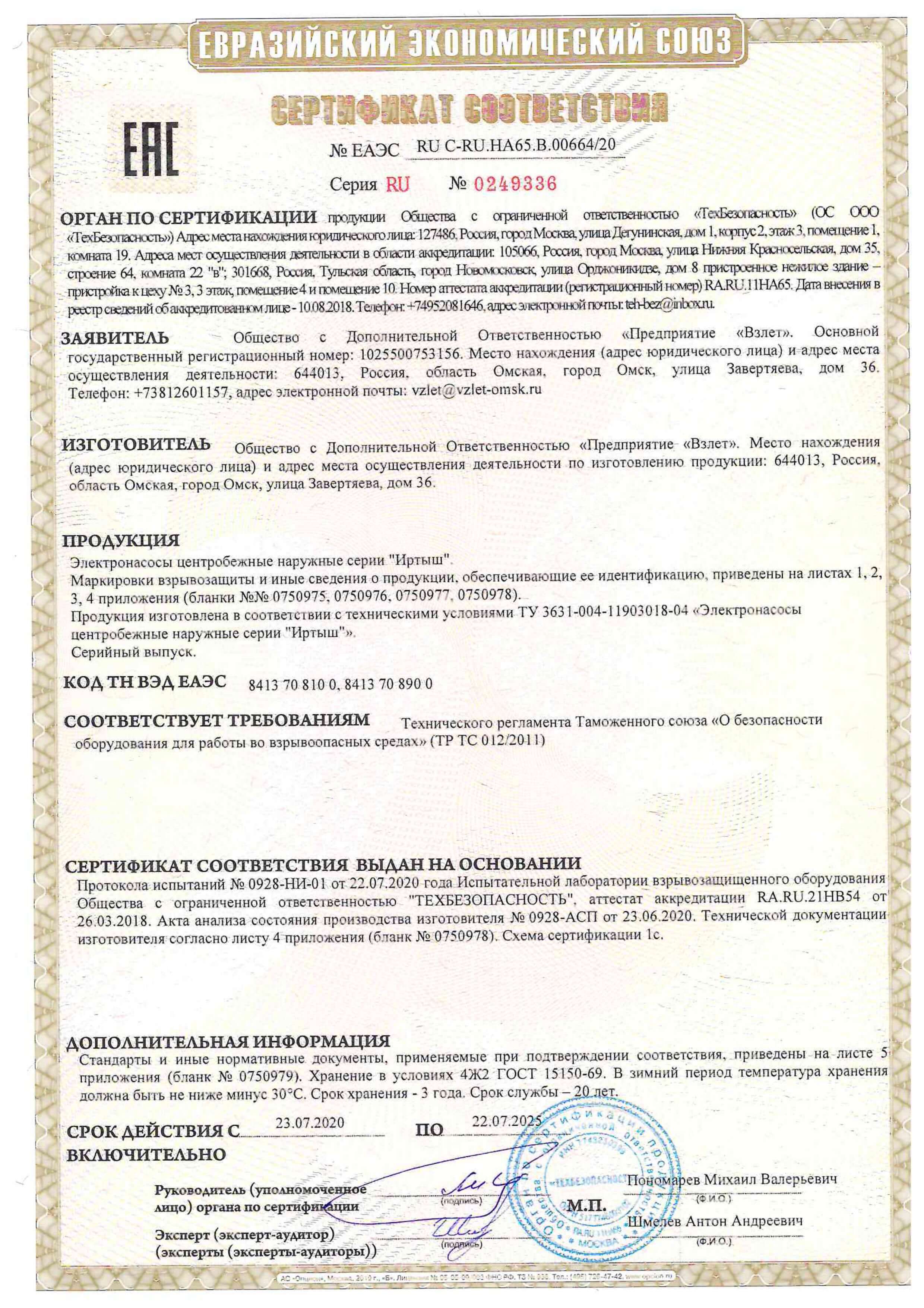 Сертификат взрывозащита на наружные насосы