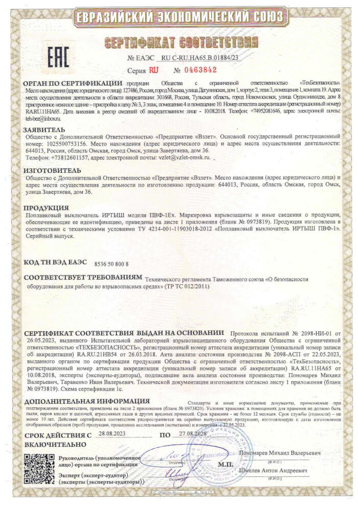 Сертификат на поплавковые выключатели взрывозащищенного исполнения "Иртыш ПВФ-1Ех"