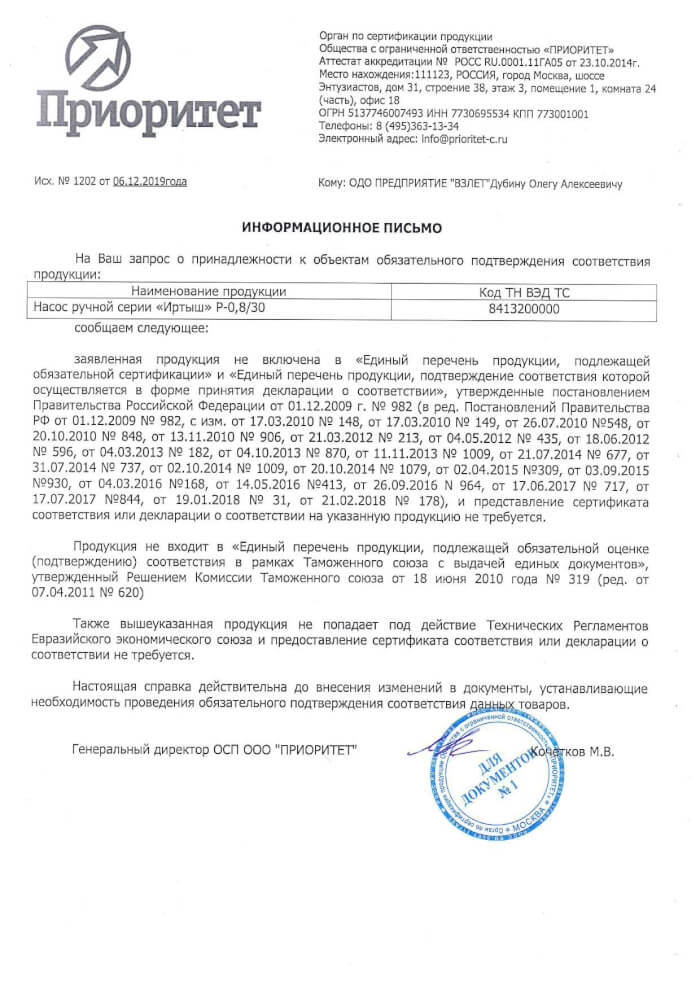 Ручной насос не подлежит сертификации