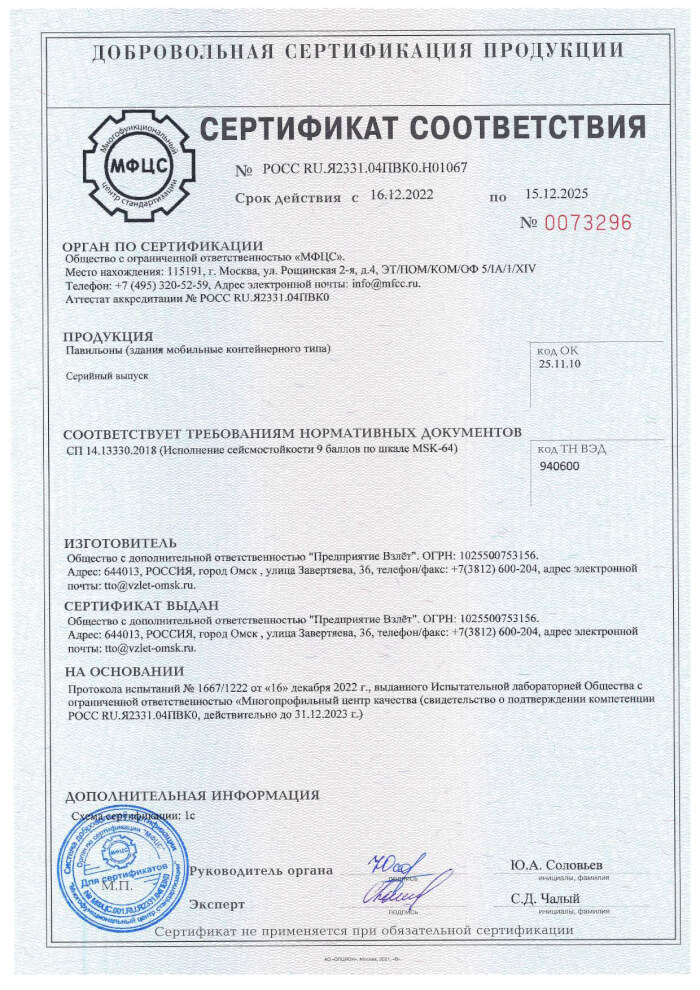 Сертификат на павильон