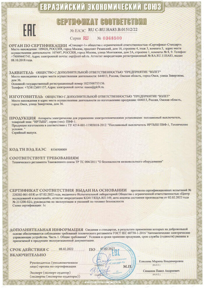 Сертификат соответствия Поплавковый выключатель Иртыш