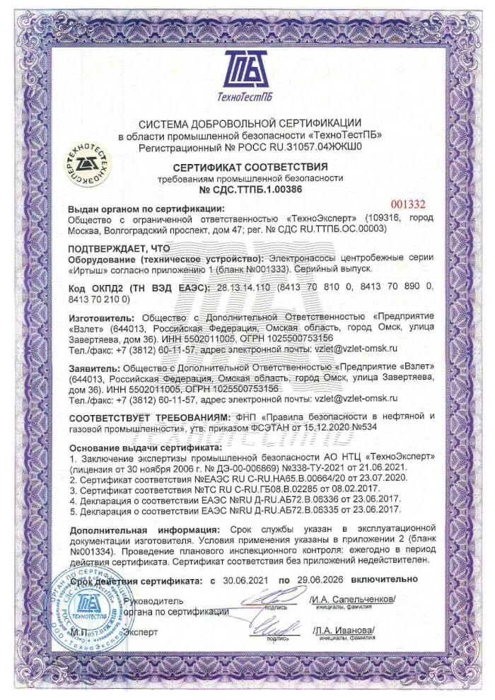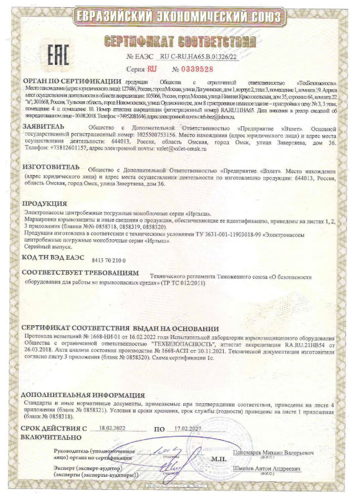 Сертификат взрывозащита на погружные насосы