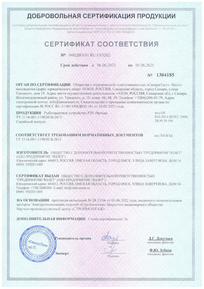 Сертификат на рыбозащитное устройство
