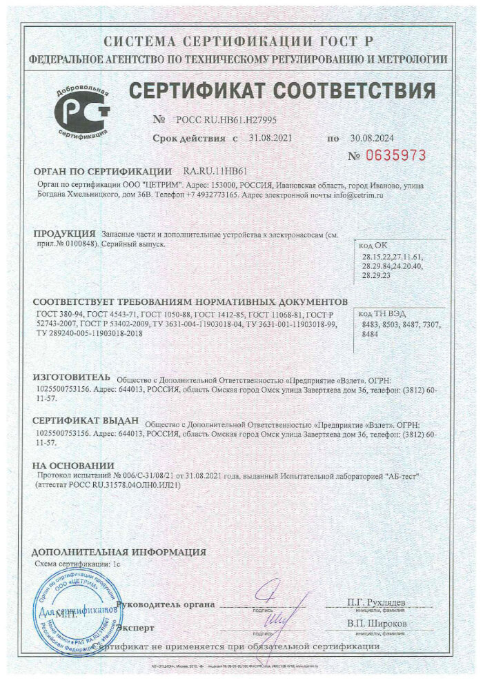 Сертификат соответствия на запчасти и дополнительные устройства к электронасосам
