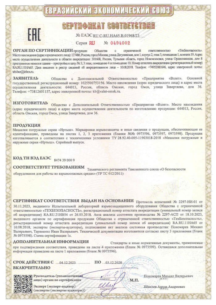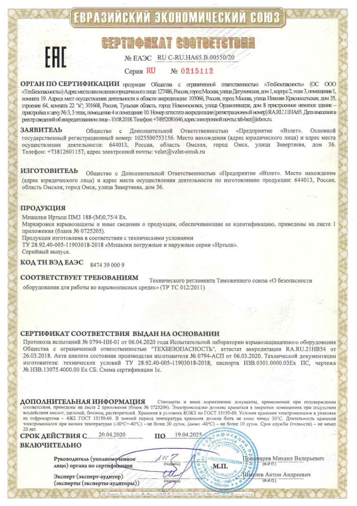 Сертификат взрывозащита на мешалки