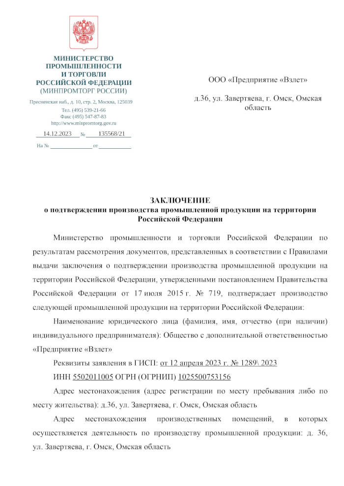 Заключение о подтверждении производства промышленной продукции на территории РФ