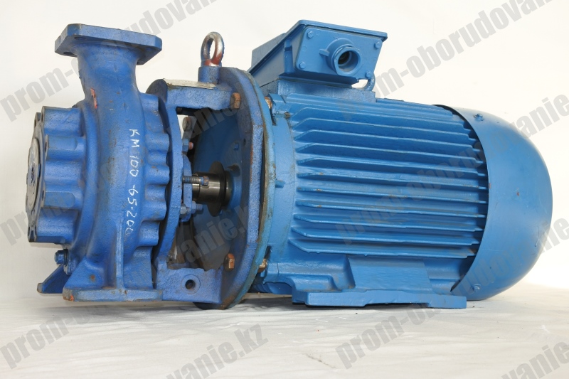 Агрегат КМ 100-65-200 составляют насосная и приводная части. Насосная – центробежного типа, двигатель – с удлинённым валом (консолью) и с фланцем для крепления к насосу. Корпус насоса КМ 100-65-200 чугунный. На нём нанесена стрелка, указывающая, в каком направлении должен вращаться вал. Он имеет внутри себя камеру спиральной формы, а снаружи – два патрубка (один – входной, другой – выходной) и лапы опорные. Фланец двигателя соединён с корпусом фонарём.